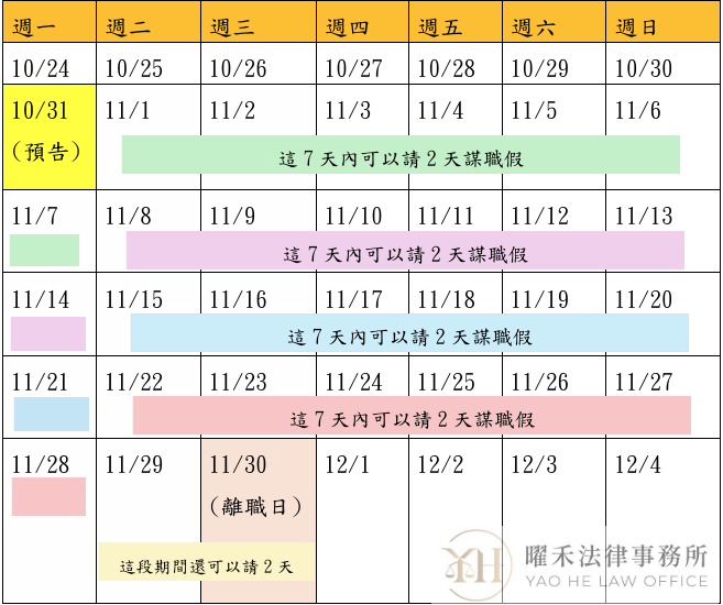 舉例來說,勞工的年資7年,離職日是11/30,依法最晚要在10/31告訴勞工資遣一事,從11/1開始每7日就有2天可以請謀職假。以這個案例來說,勞工總共最多可以請10天的謀職假。